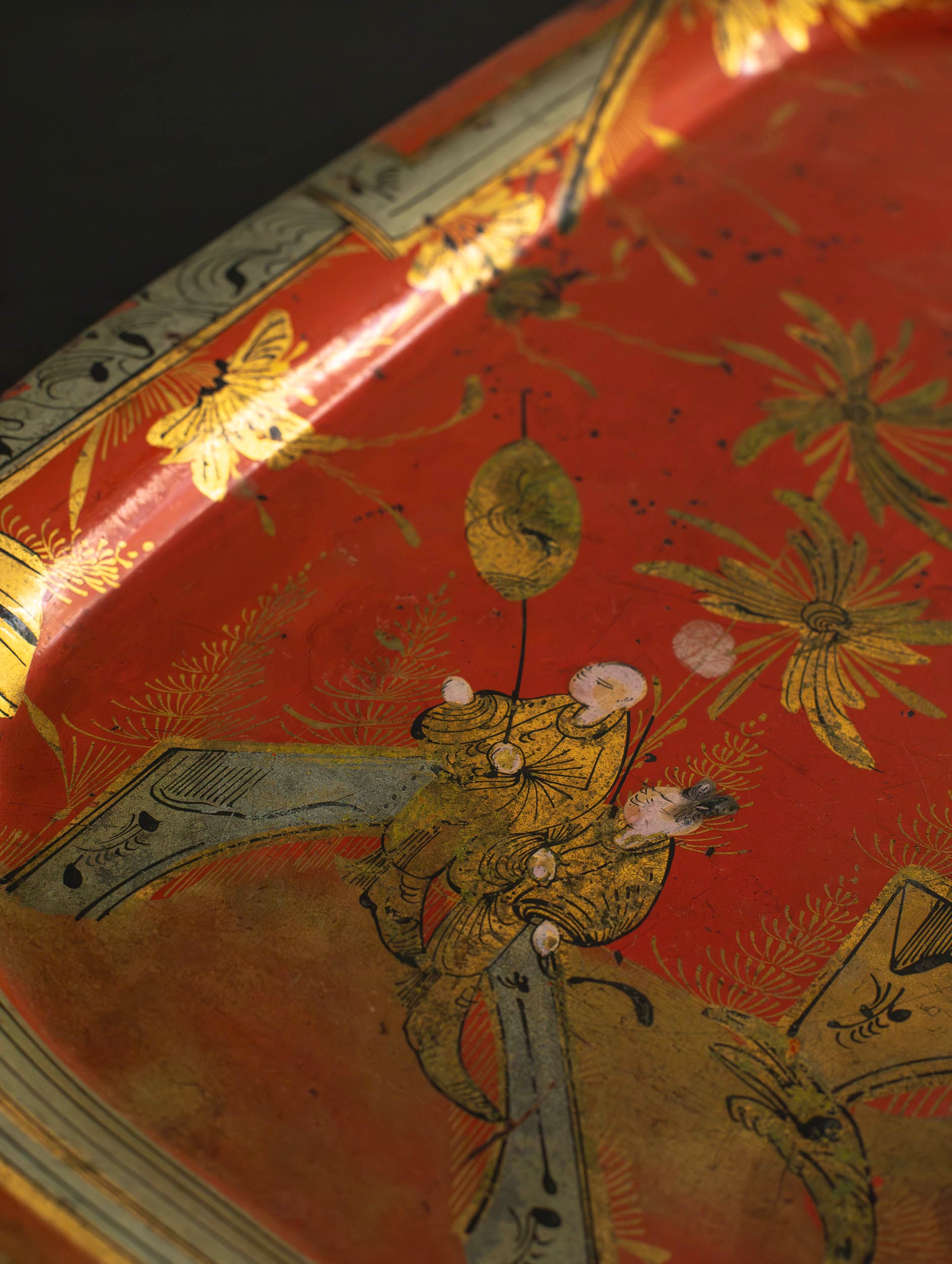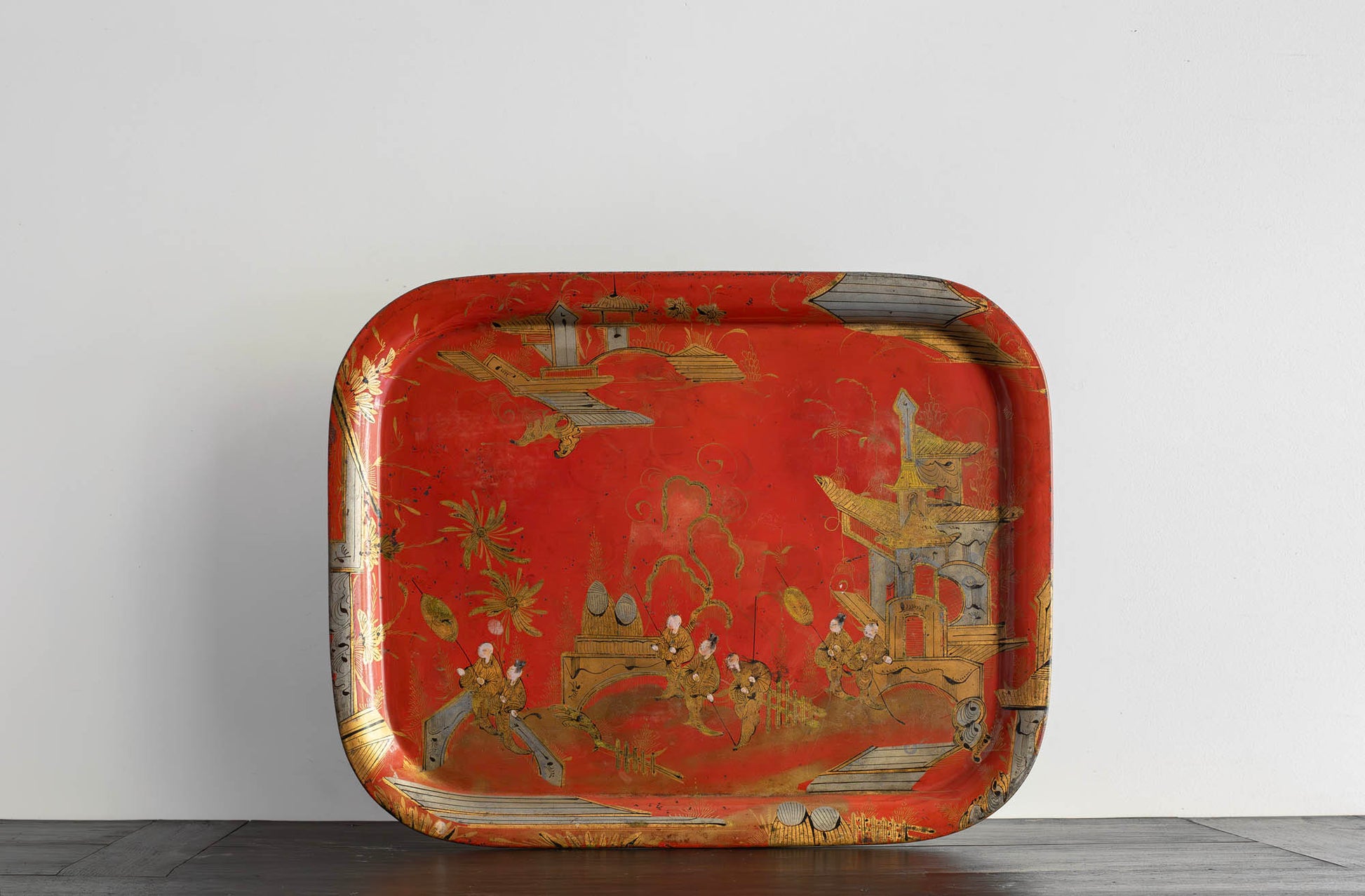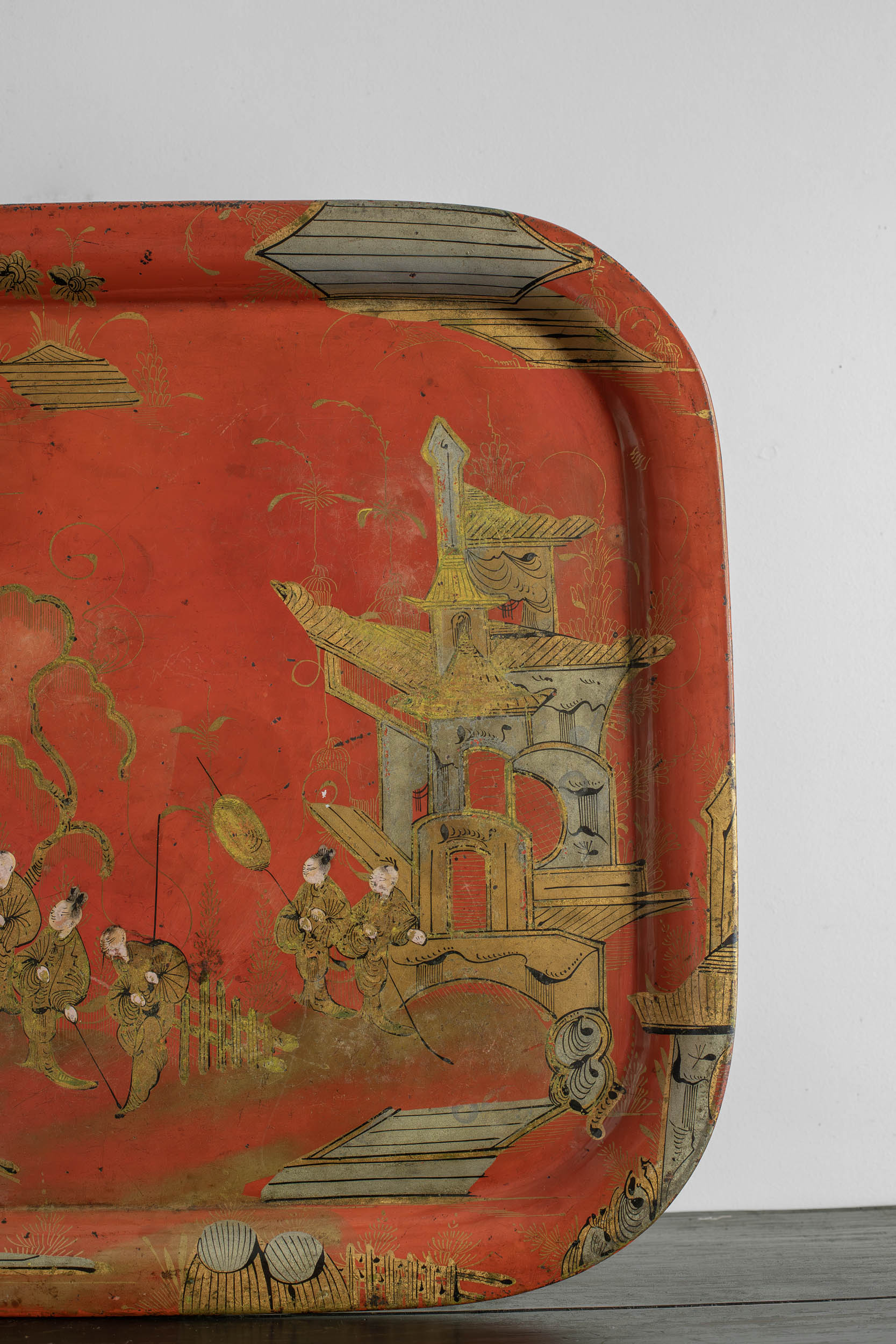 Bandeja de metal esmaltado con dibujos de chinerías, realizada en Francia en estilo Napoleón III, el cual abrazó el ideario estético del Antiguo Régimen, hallando en él una fuente inagotable de inspiración, de la que esta pieza es un ejemplo paradigmático.