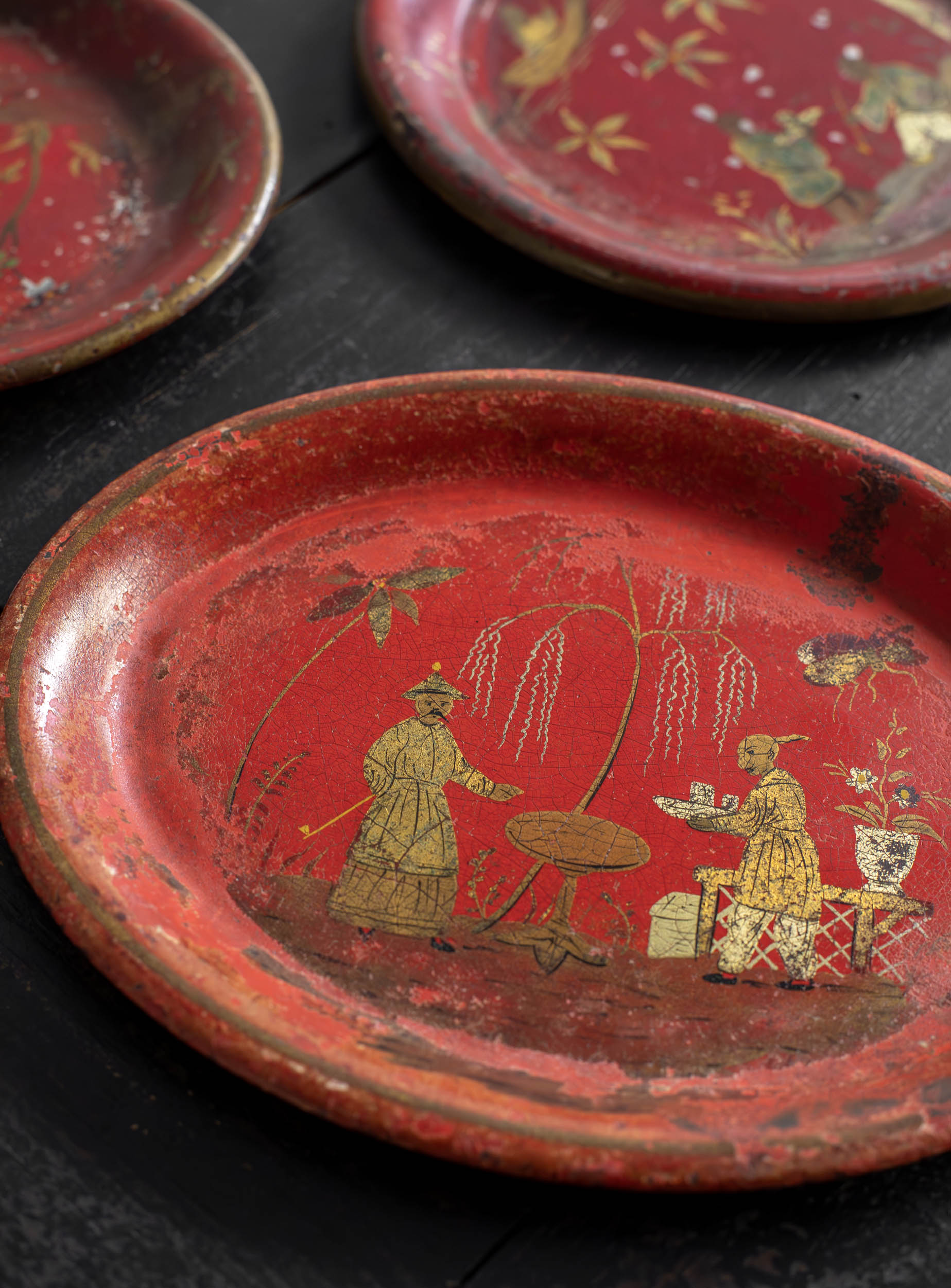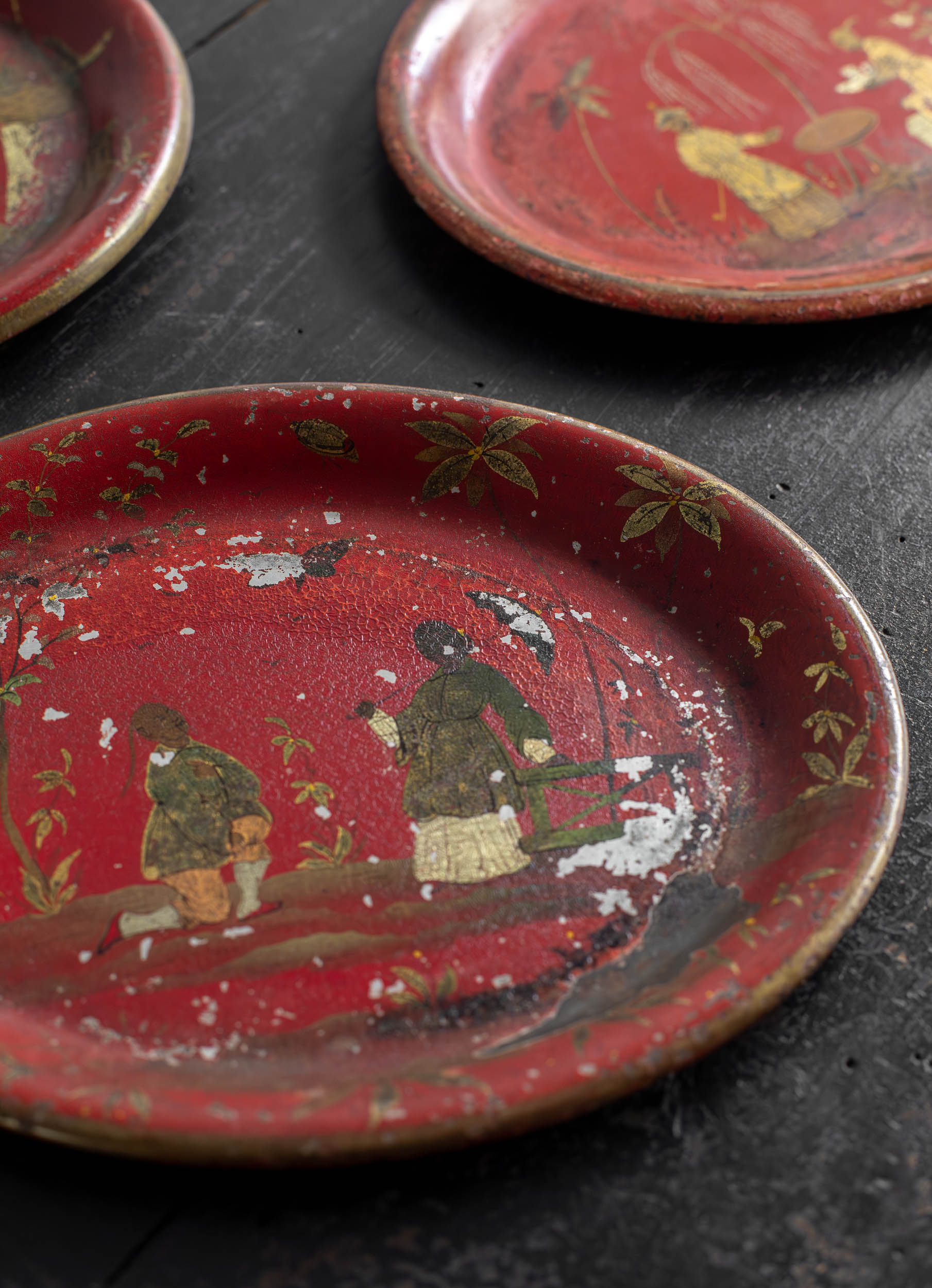 Pequeñas bandejas de metal esmaltado en tonos coral y oro viejo con dibujos de chinerías, realizada en Francia en estilo Napoleón III, el cual abrazó el ideario estético del Antiguo Régimen, hallando en él una fuente inagotable de inspiración, de la que esta pieza es un ejemplo paradigmático.