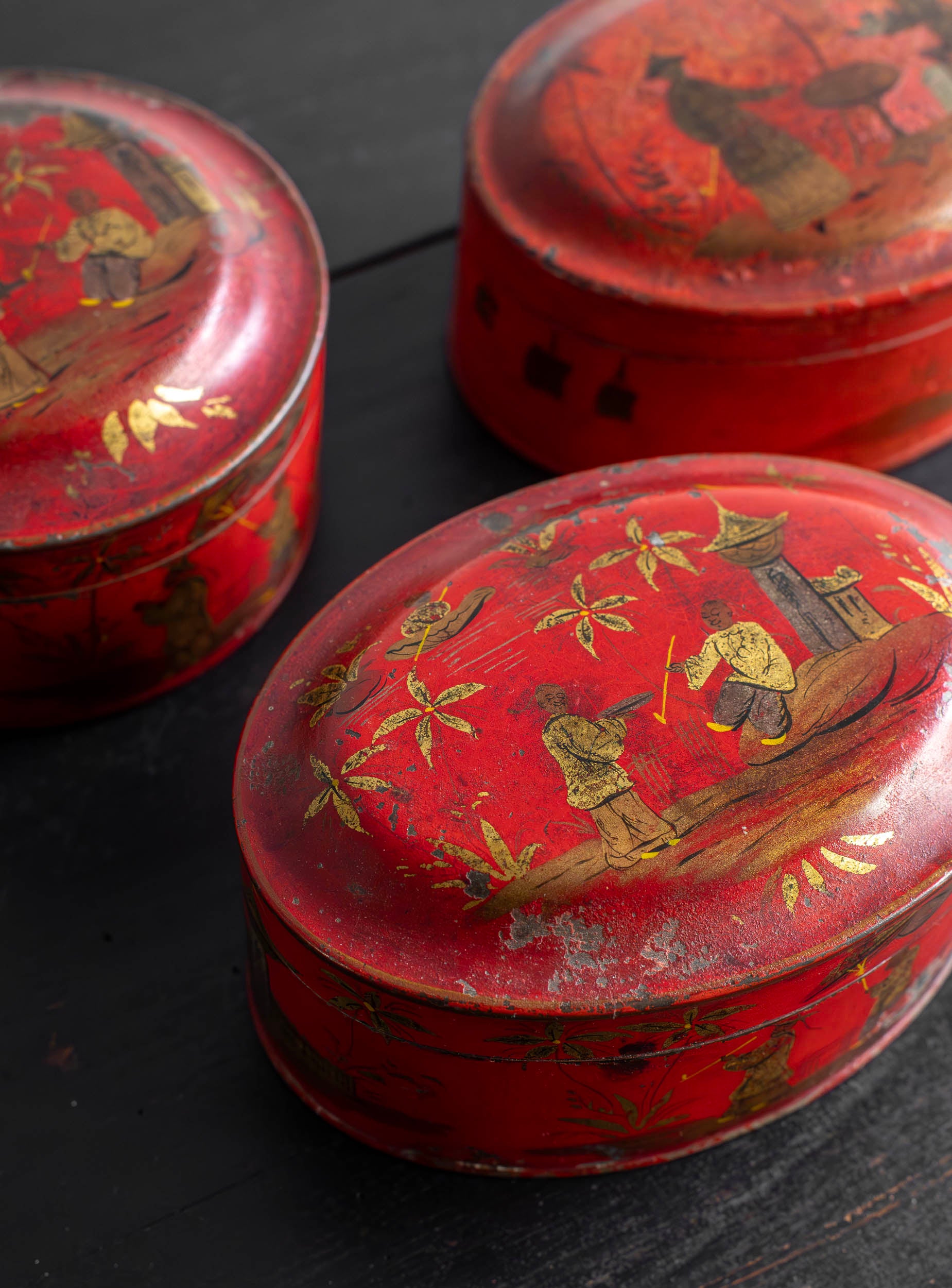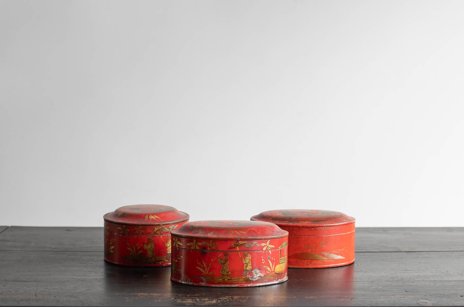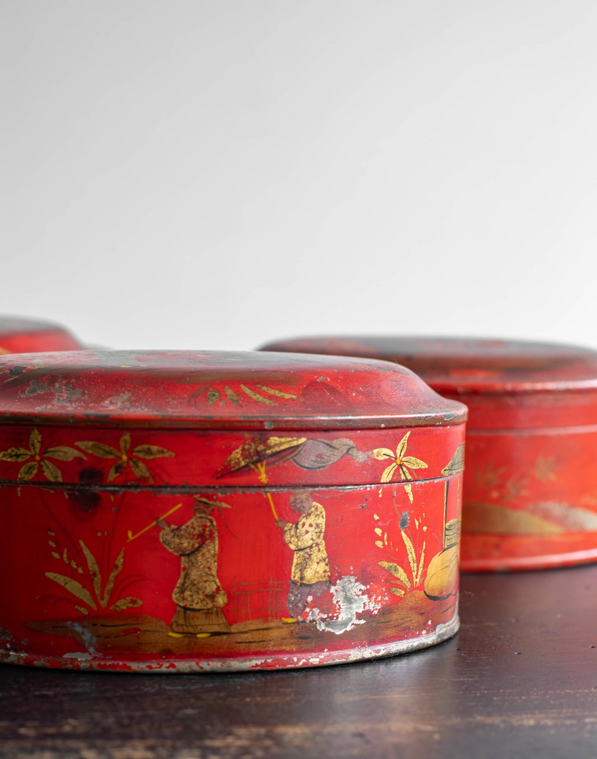 Cajas decorativas de metal esmaltado en tonos coral y oro viejo con dibujos de chinerías, realizada en Francia en estilo Napoleón III, el cual abrazó el ideario estético del Antiguo Régimen, hallando en él una fuente inagotable de inspiración, de la que esta pieza es un ejemplo paradigmático.