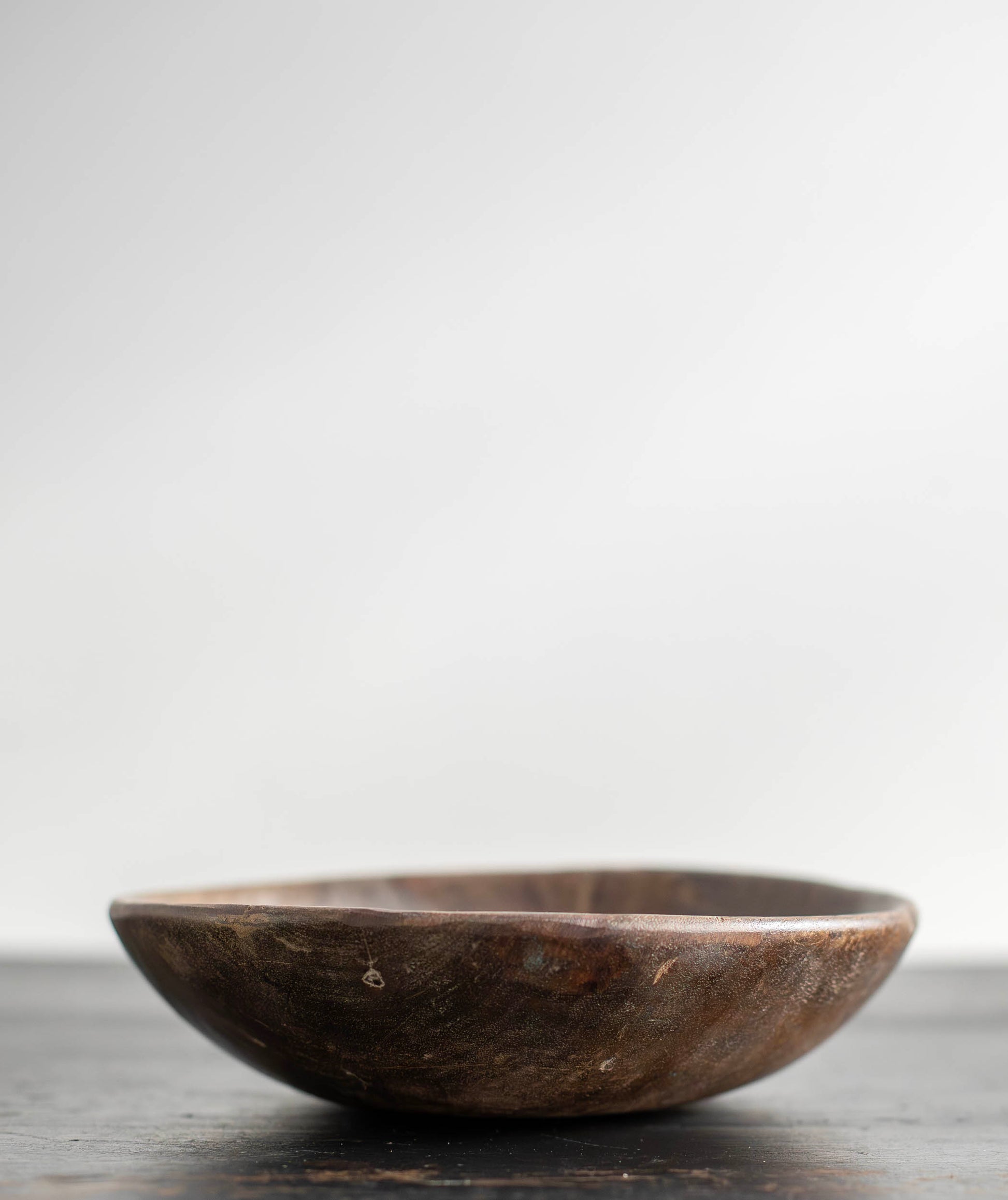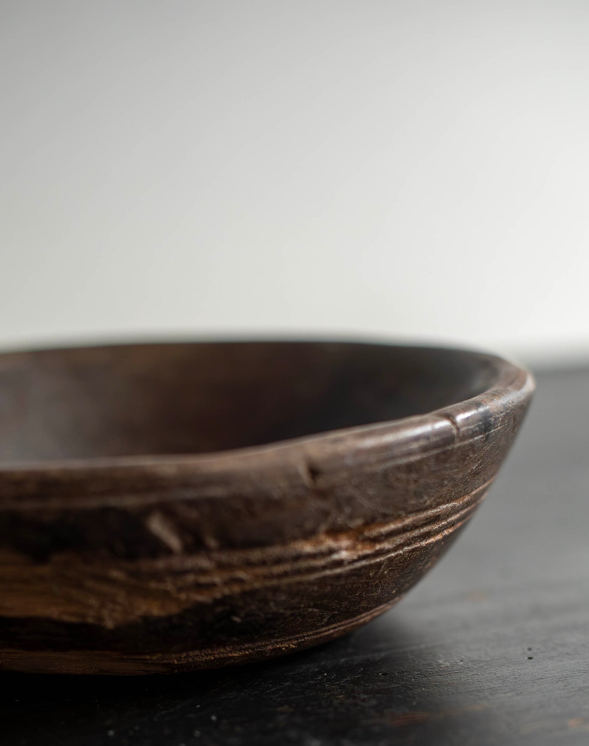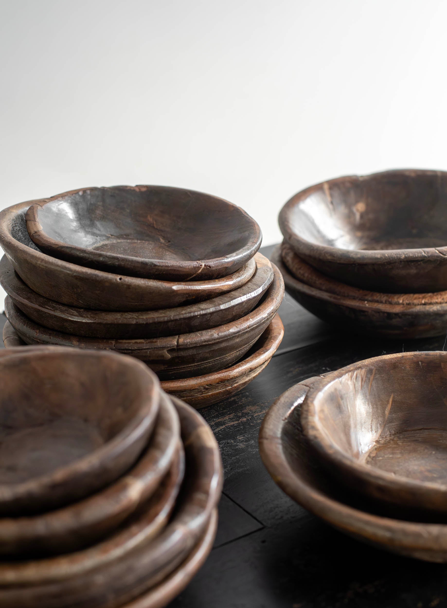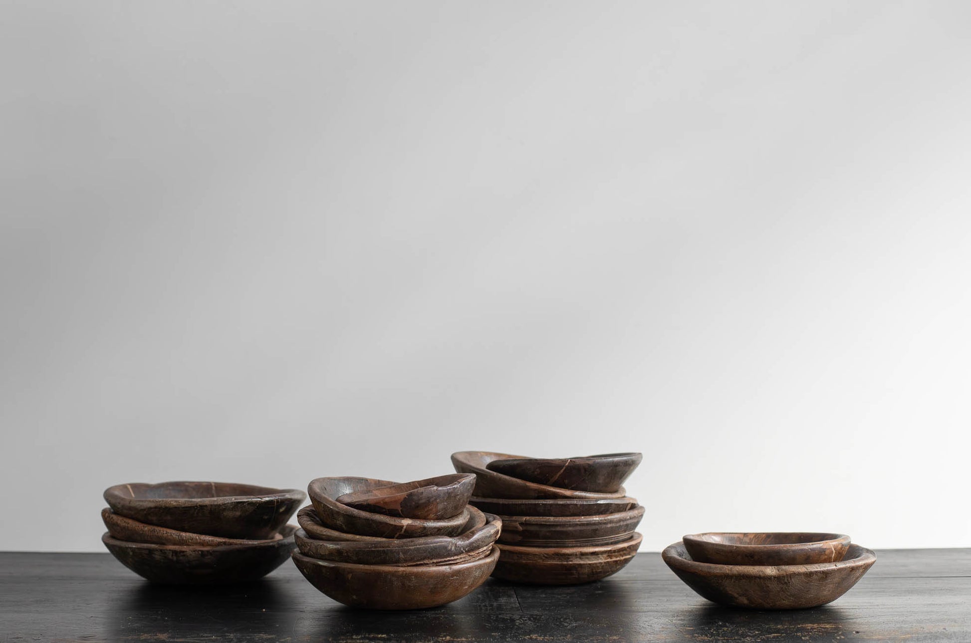 Cuencos tallados en teca, madera de alta durabilidad y gran resistencia a hongos, xilófagos y ácidos, lo cual hace que se la considere una de las más valiosas, con una pátina añadida posteriormente con el uno. Procede del interior del Principado de Hyderabad, en el sureste de la península del Indostán y fue realizados para uso domestico entre finales del XIX y mitad del siglo XX
