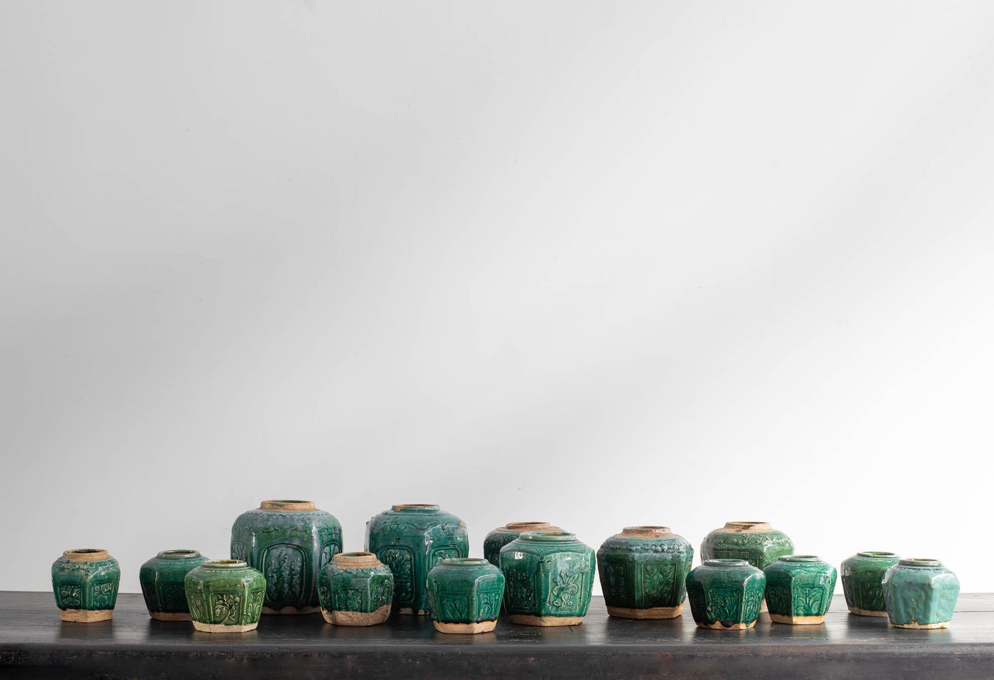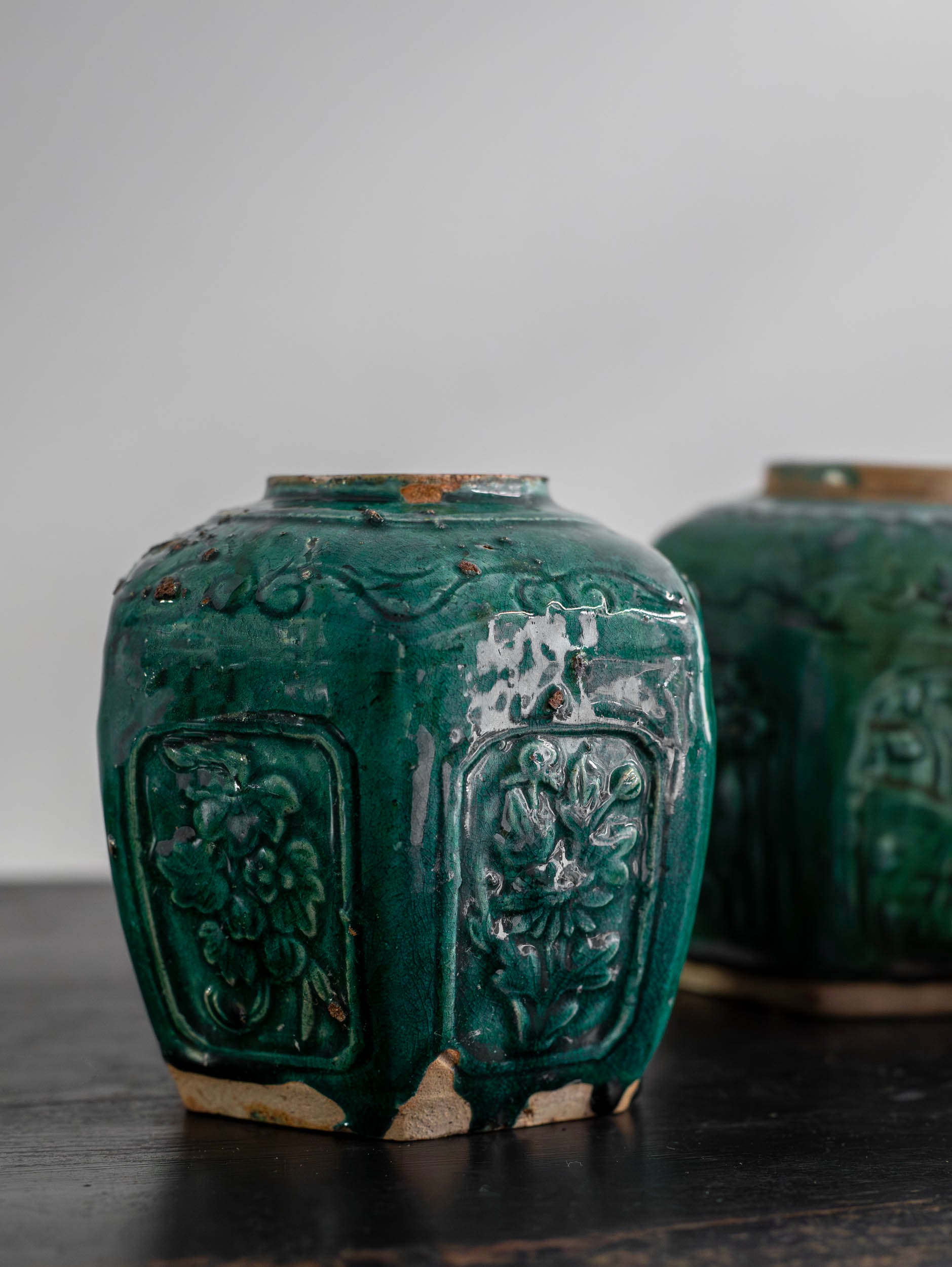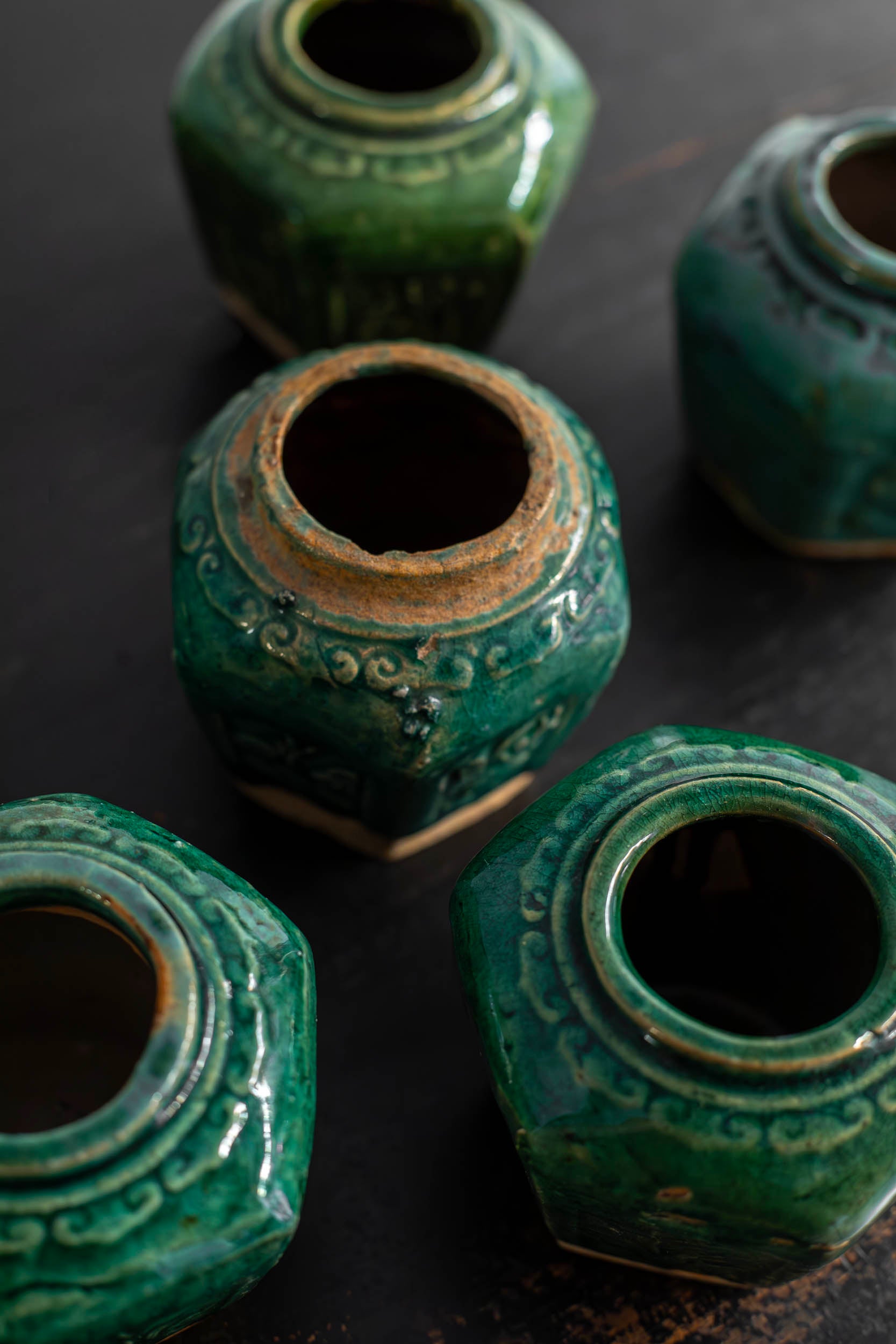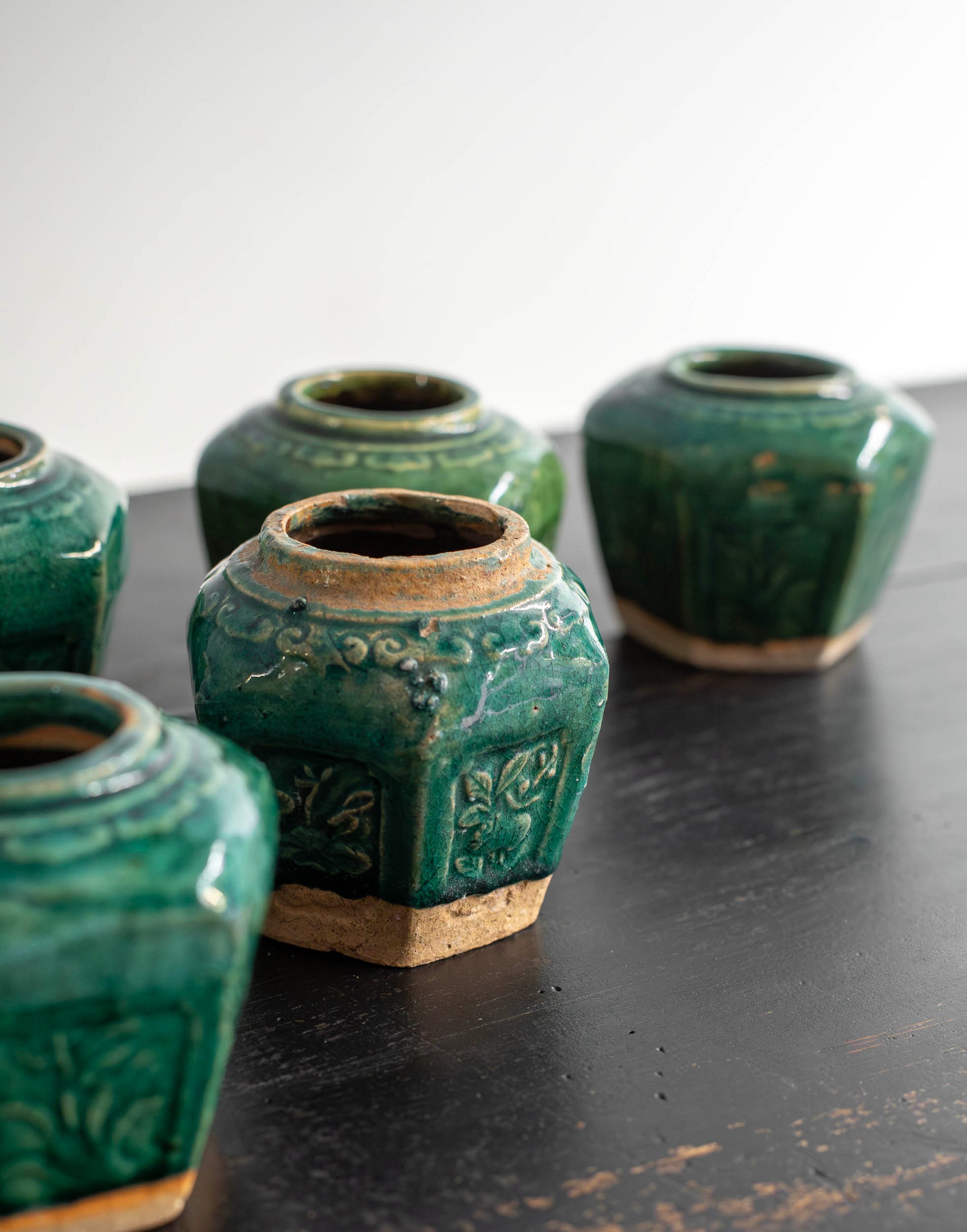 Estos tarros de forma hexagonal con escenas florales en relieve y esmaltados de color verde se usaban para guardar el jengibre, preciado tubérculo presente extensamente tanto en la cocina como en la medicina tradicional China. Provienen de Shiwan, distrito de Shiwanzhen de la ciudad de Fosha conocida como la capital de la cerámica en sur de China.